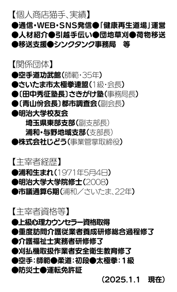 振り返れば、「悔いなき人生を歩みたい」と高卒直後に空手修行の道に入り、その後、市民活動に関わった流れで1999年27歳の時に、浦和市議会議員に初当選。2001年29歳で合併反対の立場を踏まえてさいたま市誕生の合併時に議員辞職。2年の深夜コンビニバイトを経て、2003年31歳でさいたま市初の選挙において2期目の当選。以後、継続して当選を果たし、結果的には計6期22年に渡り議員を務めてきました。